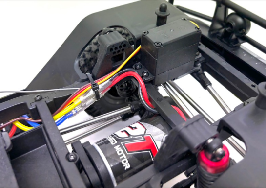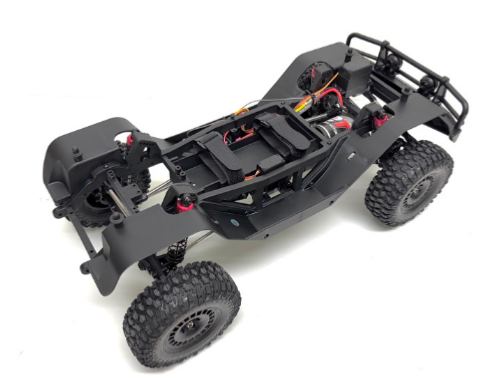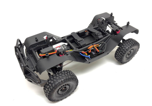 Le châssis CR4.4 est placé sous la carrosserie, ce qui le rend très robuste et capable d’affronter les obstacles les plus difficiles en tout-terrain ! La puissance est fournie par un moteur charbon 32T 550 à fort couple et un contrôleur étanche compatible 2-3S, qui transmettent l’énergie via un différentiel central solide et une transmission entièrement montée sur roulements à billes.
