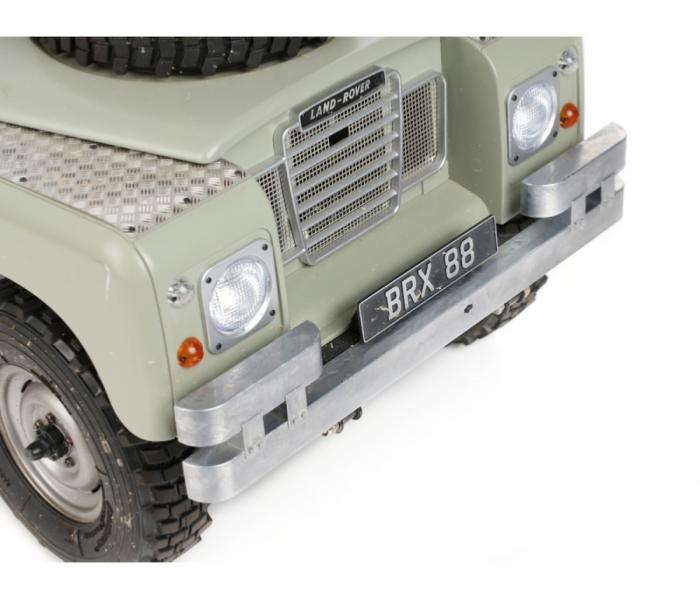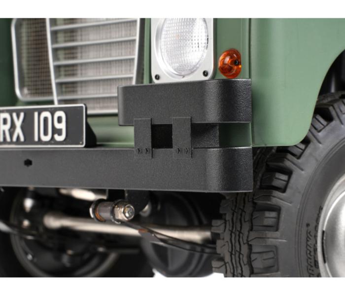 Il s'agit d'un pare-chocs avant en aluminium de style militaire pour véhicules tout-terrain Land Rover. Il est couramment utilisé sur les versions militaires des camions Series et Lightweight. Les butoirs sont moulés avec le pare-chocs en aluminium. L'orifice pour la manivelle sur le pare-chocs lui confère un aspect réaliste.
