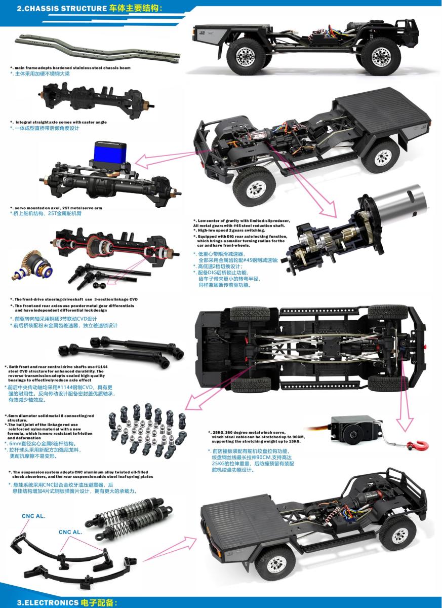Caractéristiques : Le Land Commander est équipé d'un essieu droit moulé d'un seul tenant avec un pivot à angle de chasse. Son CVD avant utilise une conception à triple articulation à rotule (communément appelée arbre de transmission à triple articulation à rotule), ce qui améliore considérablement la souplesse de la direction à grands angles. Le Land Commander est équipé d'une transmission à deux vitesses et d'un système de boîte de vitesses à réduction pour l'unité de creusage. La fonction de creusage offre un blocage de l'essieu arrière, permettant de passer librement du mode traction avant au mode quatre roues motrices, ce qui se traduit par un rayon de braquage extrêmement petit. Sa transmission à rotation inverse réduit efficacement l'effet d'essieu, offrant une expérience plus stable et une posture de conduite parfaite. Le Land Commander adopte un style de pick-up réaliste, et la carrosserie est fabriquée à partir d'un matériau PC de 1,5 mm d'épaisseur et regorge de détails internes. Il est équipé en usine d'un hayon arrière extensible mobile, d'une galerie de toit et d'un pneu de secours, ce qui permet aux joueurs de combiner les éléments selon leurs préférences pour assembler leur propre véhicule personnalisé. Pour répondre aux besoins des conditions tout-terrain difficiles, le « Land Commander » est équipé de série d'un crochet de treuil fonctionnel, d'une suspension arrière combinant des ressorts à lames et des amortisseurs à huile, et d'un système d'éclairage LED multimode.