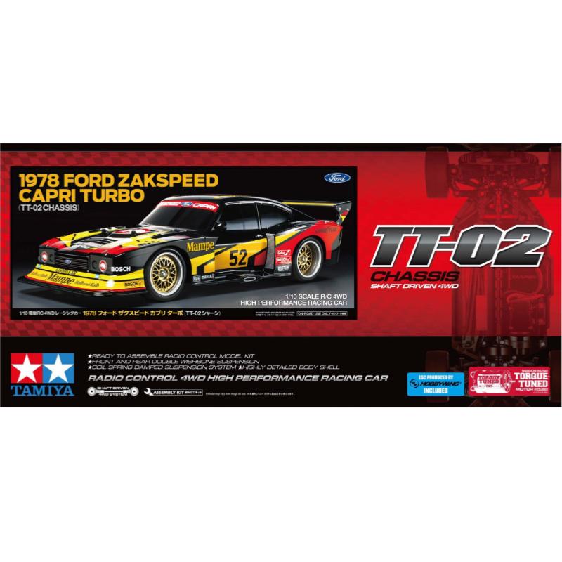 Tamiya présente une nouvelle réplique de voiture de compétition associée au châssis TT-02 : la Ford Zakspeed Capri Turbo 1978. Conçue pour le DRM (Deutsche Rennsport Meisterschaft) en 1978 par l’équipe ouest-allemande Zakspeed, cette voiture affichait une carrosserie extrêmement basse et élargie, entièrement optimisée en soufflerie. Son poids contenu de 790 kg et son moteur 4 cylindres en ligne 1 427 cm³ DOHC turbocompressé délivrant 375 ch assuraient des performances remarquables. Elle obtint sa première victoire lors de la 11 manche du DRM au Nürburgring en octobre 1978. La saison suivante, elle termina deuxième à la première course du championnat, puis remporta la seconde. Voici une superbe réplique RC en kit de cette voiture sur la base du châssis TT-02 !